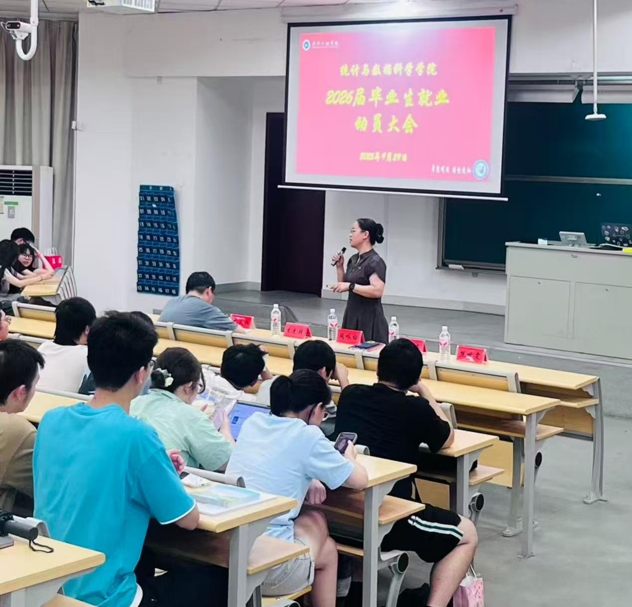 校园新闻网讯 为帮助2026届毕业生准确把握就业形势,科学规划职业生涯,促进毕业生高质量充分就业,9月29日晚,统计与数据科学学院于阶一201教室召开2026届毕业生就业动员大会。学院党委书记陶咏梅、校学生处(学工部、招就办)副处长李先锋、就业工作辅导员熊世雯、各毕业班班主任出席本次大会,会议由熊世雯主持。