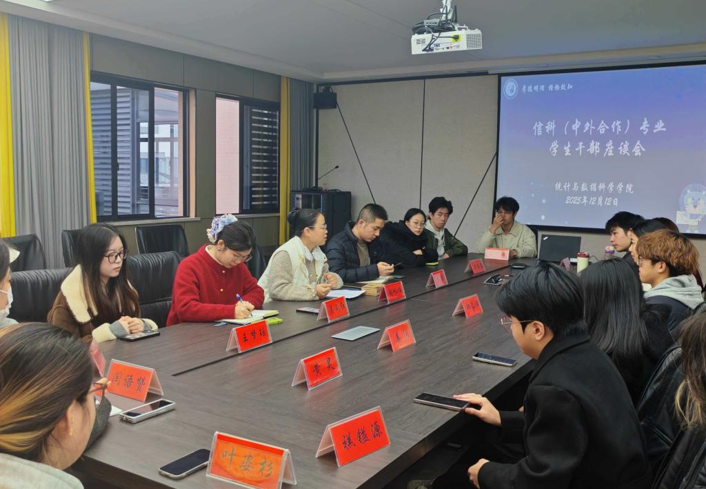 校园新闻网讯 为落实学校优化学科布局、整合办学资源的战略部署,进一步突出办学特色、强化发展优势,推动信息与计算科学(中外合作办学)专业与统计与数据科学学院深度融合、协同发展,充分发挥学生干部的先锋模范与桥梁纽带作用,12月12日下午,我院于东一503会议室召开专题座谈会。学院党委书记陶咏梅、学工办主任李杨、辅导员吴成红与该专业全体团学学生干部面对面交流,倾听诉求、解答困惑、共话成长。